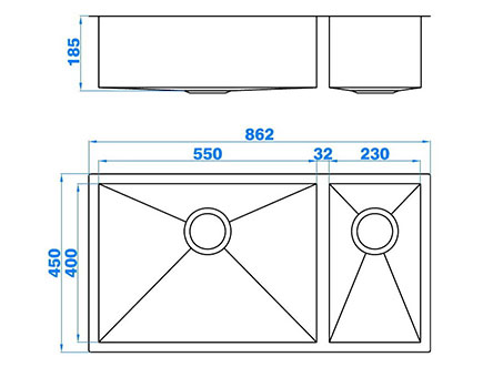 型號:711L款式:雙盆安裝方式:臺底式總尺寸:862*450 mm大盆:550*400*185 mm小盆:230*400*185 mm